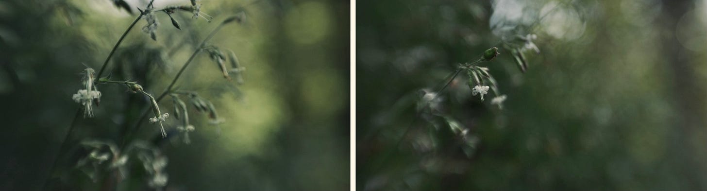 I cannot decide if the lane I am walking is rain drenched or sun soaked, either way it is crowded with flowers this morning and thousands of caterpillars slipped from their oak leaf moorings during last nights storm. I try not to step on tiny green bodies while wondering about the importance of their number in the evolution of all things, then, how much damage they might cause to the oak trees from whence they came had they not fallen. I deduce only that nature has reason for everything.