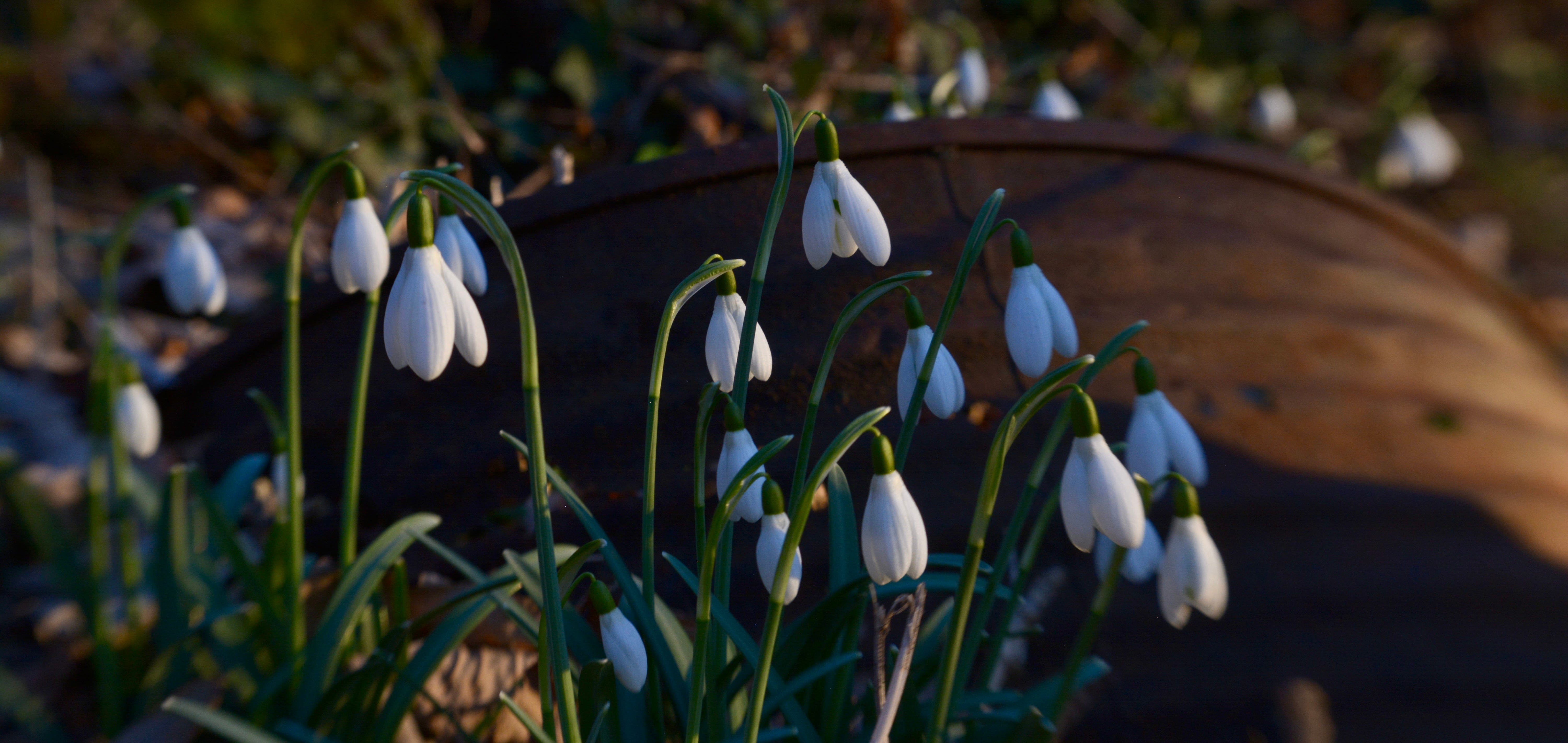 Last year in late spring, when the earth was still soft and crumbly like chocolate cake, I unearthed a rusty drum hidden on the bank. I pulled and dug to release it from root and stone and with it many tiny white bulbs were dislodged. I stopped and gathered and replanted those that were escaped, left the rusting drum half buried, returning earth and leaf-mulch and waited. For this year. I had a feeling… Today the bulbs are snowdrops, their dainty white bells cover half the bank, next year there will be more…