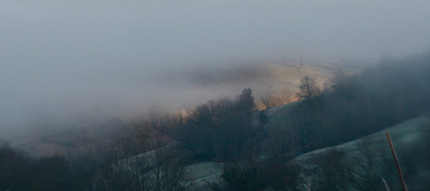 On a morning when the hillsides are still shaking off night, when first sunbeams timidly slither between folds of darkness parting land from sky and a deep frost clings onto curtains of fog in a ghostly ocean with seaweed trees, I am walking between the ash and frosted ivy on the path along the way to the sheep field. There is a musky scent in the air I do not expect, not the acrid scent of fox or the taint of wild boar, this is mustelidae, musky-strong, it is unmistakably badger. It is the second morning in this slow month I have caught his presence in the stinging sharpness of the fresh morning air. There are no other signs. Then, the beam from my flashlight falls on footprints I recognise. I want to believe but scarcely dare to.